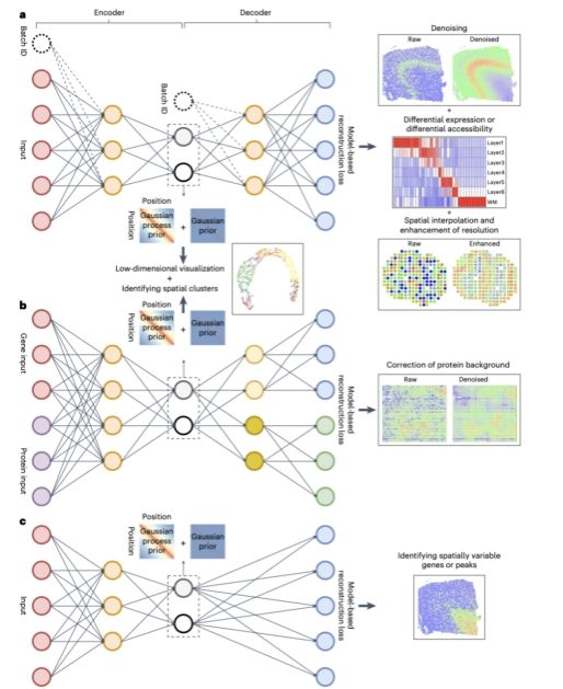 该研究基于高斯过程(Gaussian process)和变分自编码器(variational autoencoder),提出了空间依赖感知的深度生成模型 spaVAE。该模型利用高斯过程描述空间位置之间的依赖关系,得到空间转录组数据(spatially resolved transcriptomics)的统计分布,进而在统一的框架内进行降维可视化、聚类、降噪、差异表达、空间差值、提升空间分辨率等多种下游分析任务。同时,该研究进一步将spaVAE模型扩展到多种类型的空间组学数据上,例如空间染色质可及性测序(spatial ATAC-seq)和空间多组学测序(spatial CITE-seq),提出了spaPeakVAE和spaMultiVAE模型。