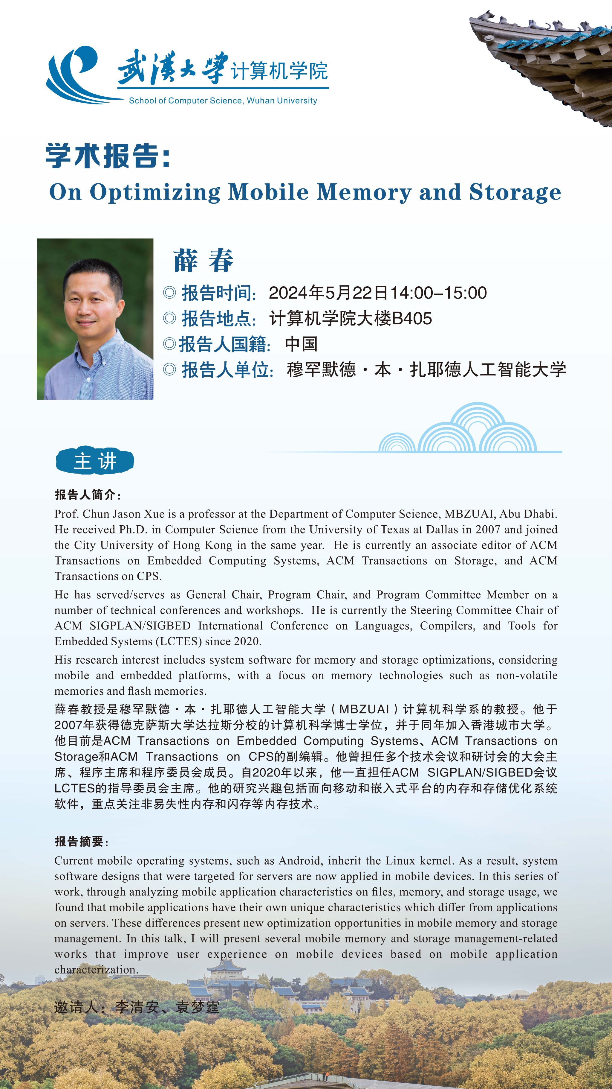报告人简介:Prof. Chun Jason Xue is a professor at the Department of Computer Science, MBZUAI, Abu Dhabi. He received Ph.D. in Computer Science from the University of Texas at Dallas in 2007 and joined the City University of Hong Kong in the same year. He is currently an associate editor of ACM Transactions on Embedded Computing Systems, ACM Transactions on Storage, and ACM Transactions on CPS.