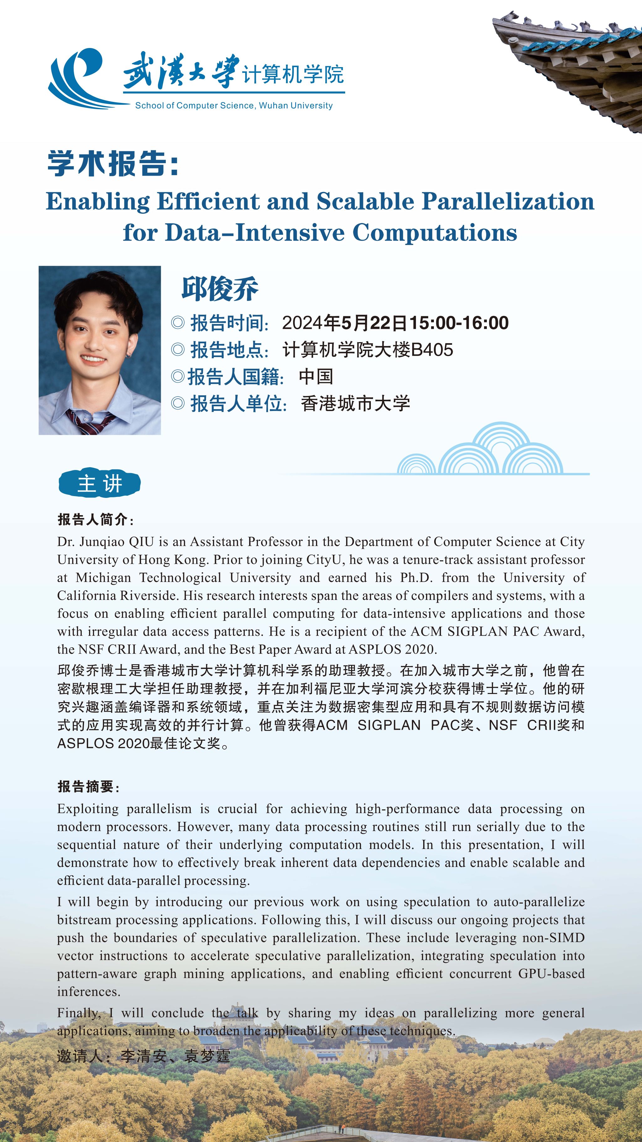 报告人简介:Dr. Junqiao QIU is an Assistant Professor in the Department of Computer Science at City University of Hong Kong. Prior to joining CityU, he was a tenure-track assistant professor at Michigan Technological University and earned his Ph.D. from the University of California Riverside. His research interests span the areas of compilers and systems, with a focus on enabling efficient parallel computing for data-intensive applications and those with irregular data access patterns. He is a recipient of the ACM SIGPLAN PAC Award, the NSF CRII Award, and the Best Paper Award at ASPLOS 2020.