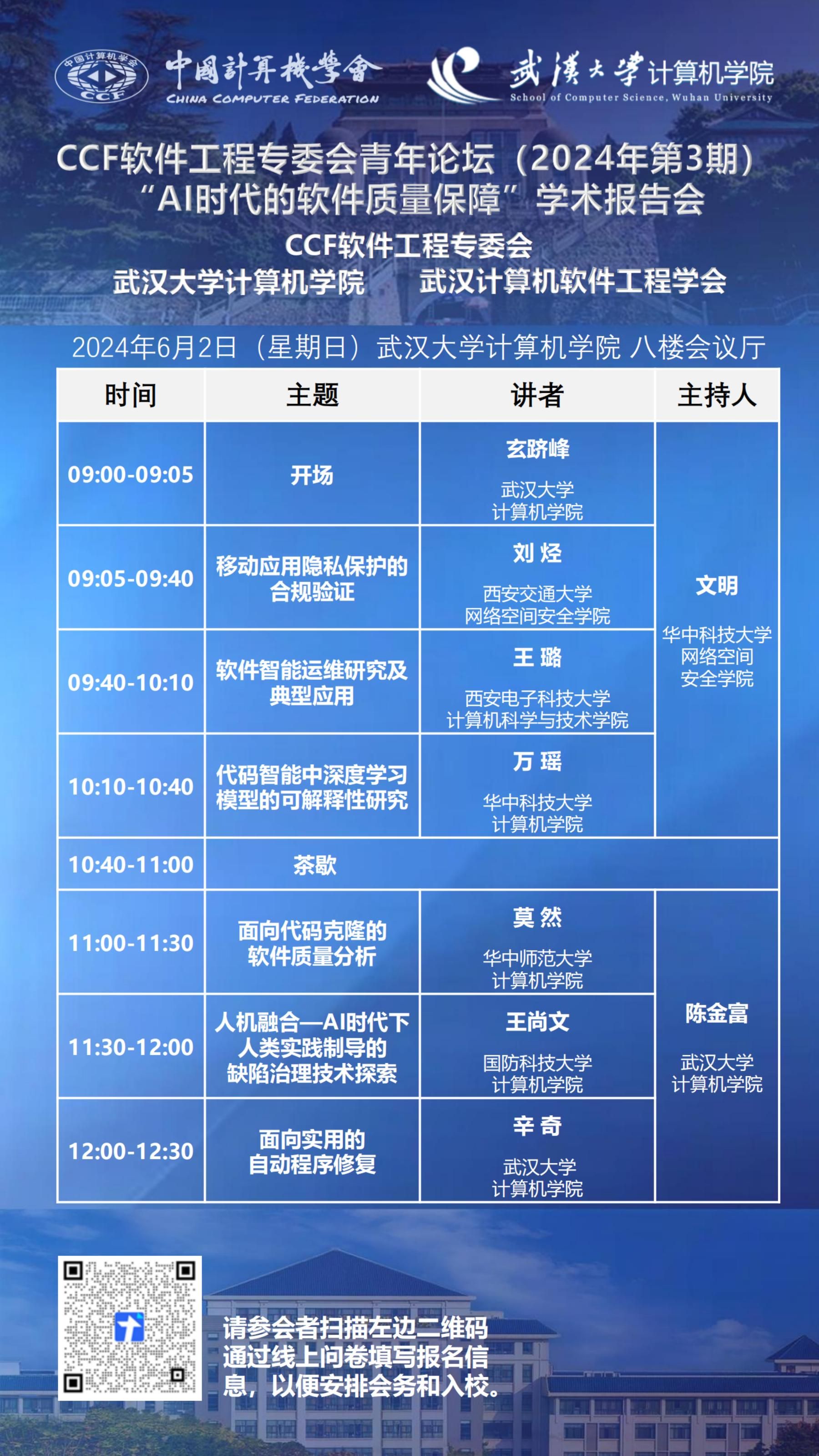 中国计算机学会软件工程专委会青年论坛学术报告会2024年第3期“AI时代的软件质量保障”学术报告会将于2024年6月2日(周日)9:00-12:30在85porn