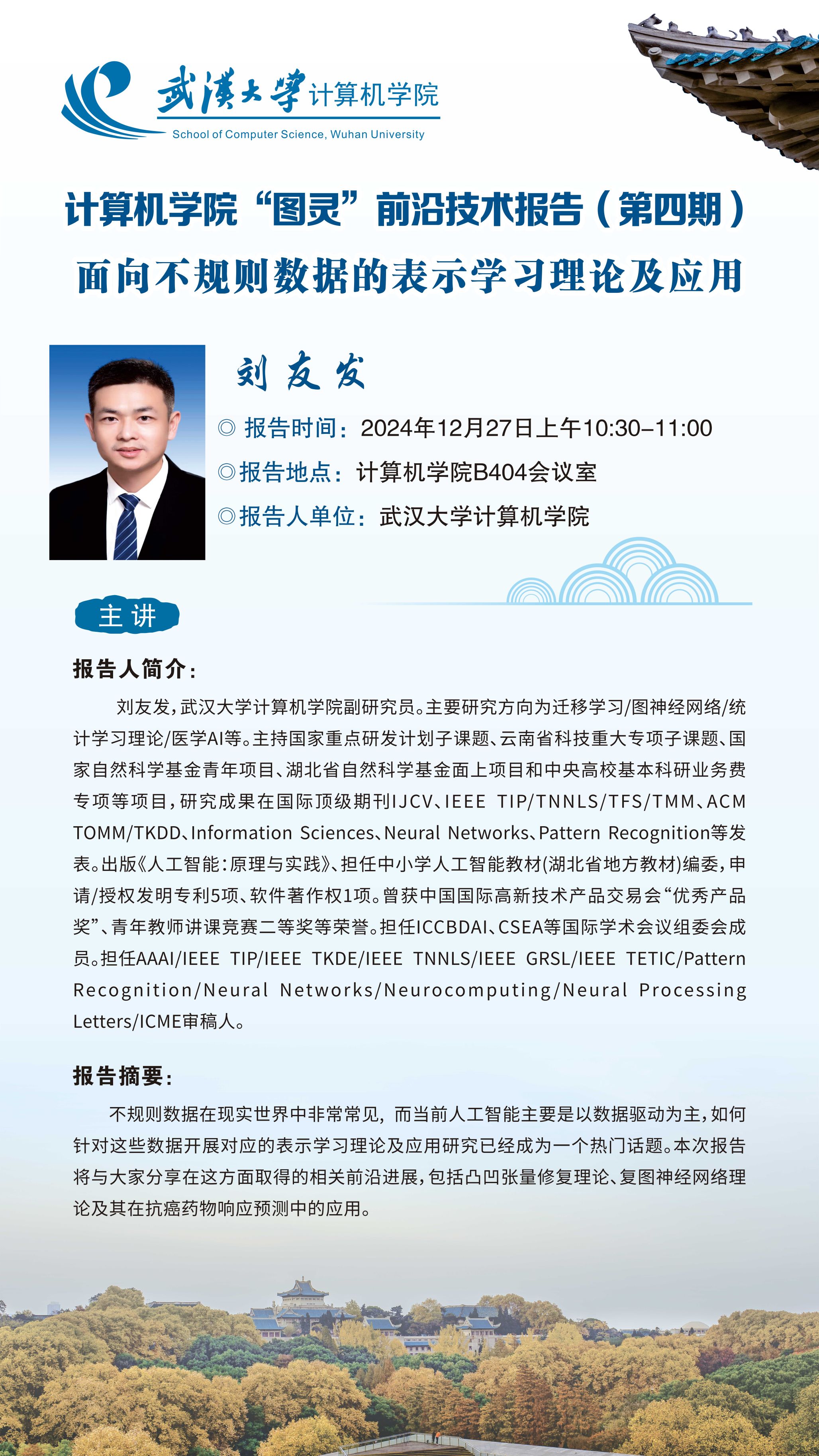 报告摘要:不规则数据在现实世界中非常常见, 而当前人工智能主要是以数据驱动为主,如何针对这些数据开展对应的表示学习理论及应用研究已经成为一个热门话题。本次报告将与大家分享在这方面取得的相关前沿进展,包括凸凹张量修复理论、复图神经网络理论及其在抗癌药物响应预测中的应用。