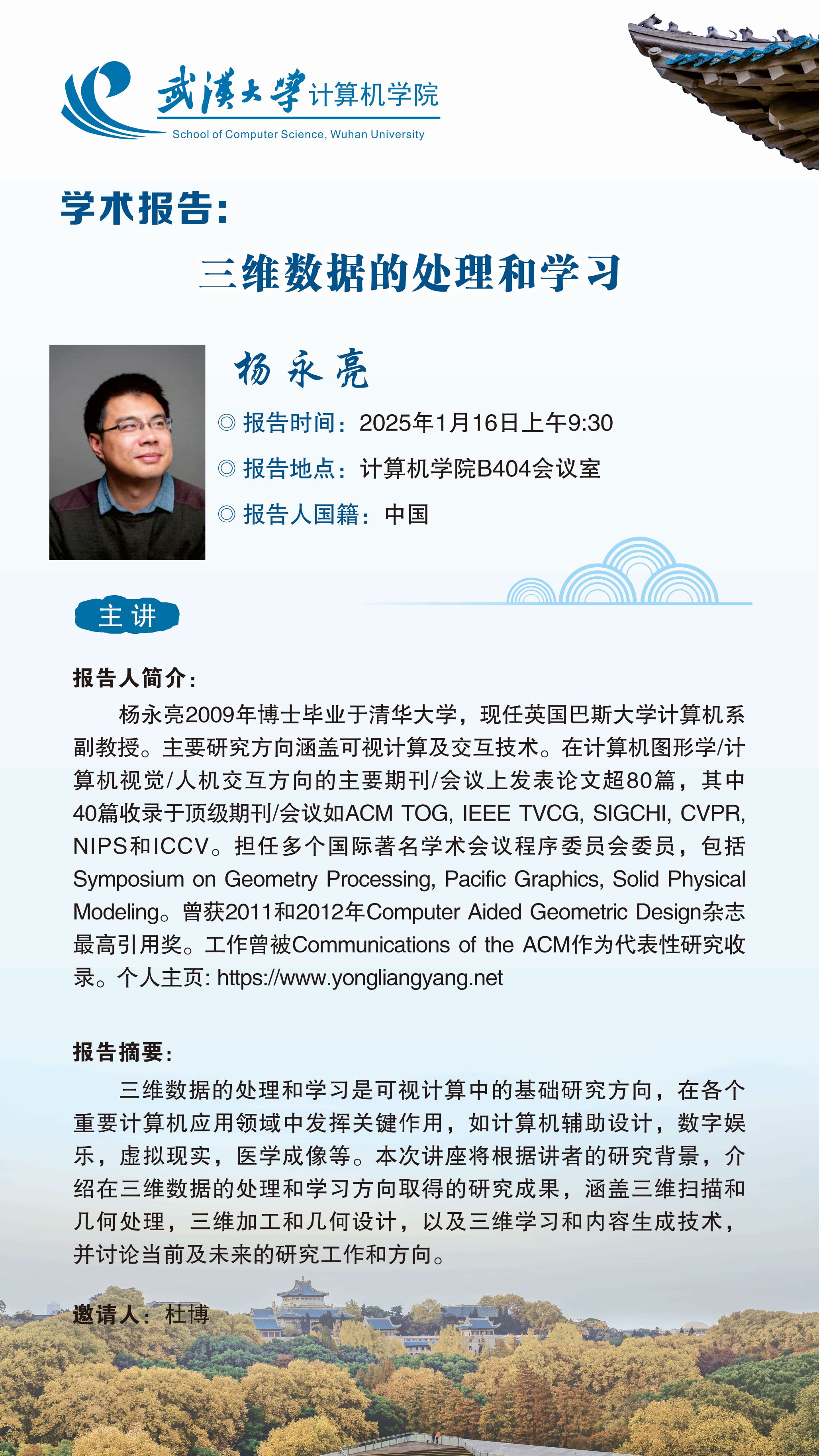 三维数据的处理和学习是可视计算中的基础研究方向,在各个重要计算机应用领域中发挥关键作用,如计算机辅助设计,数字娱乐,虚拟现实,医学成像等。本次讲座将根据讲者的研究背景,介绍在三维数据的处理和学习方向取得的研究成果,涵盖三维扫描和几何处理,三维加工和几何设计,以及三维学习和内容生成技术,并讨论当前及未来的研究工作和方向。
