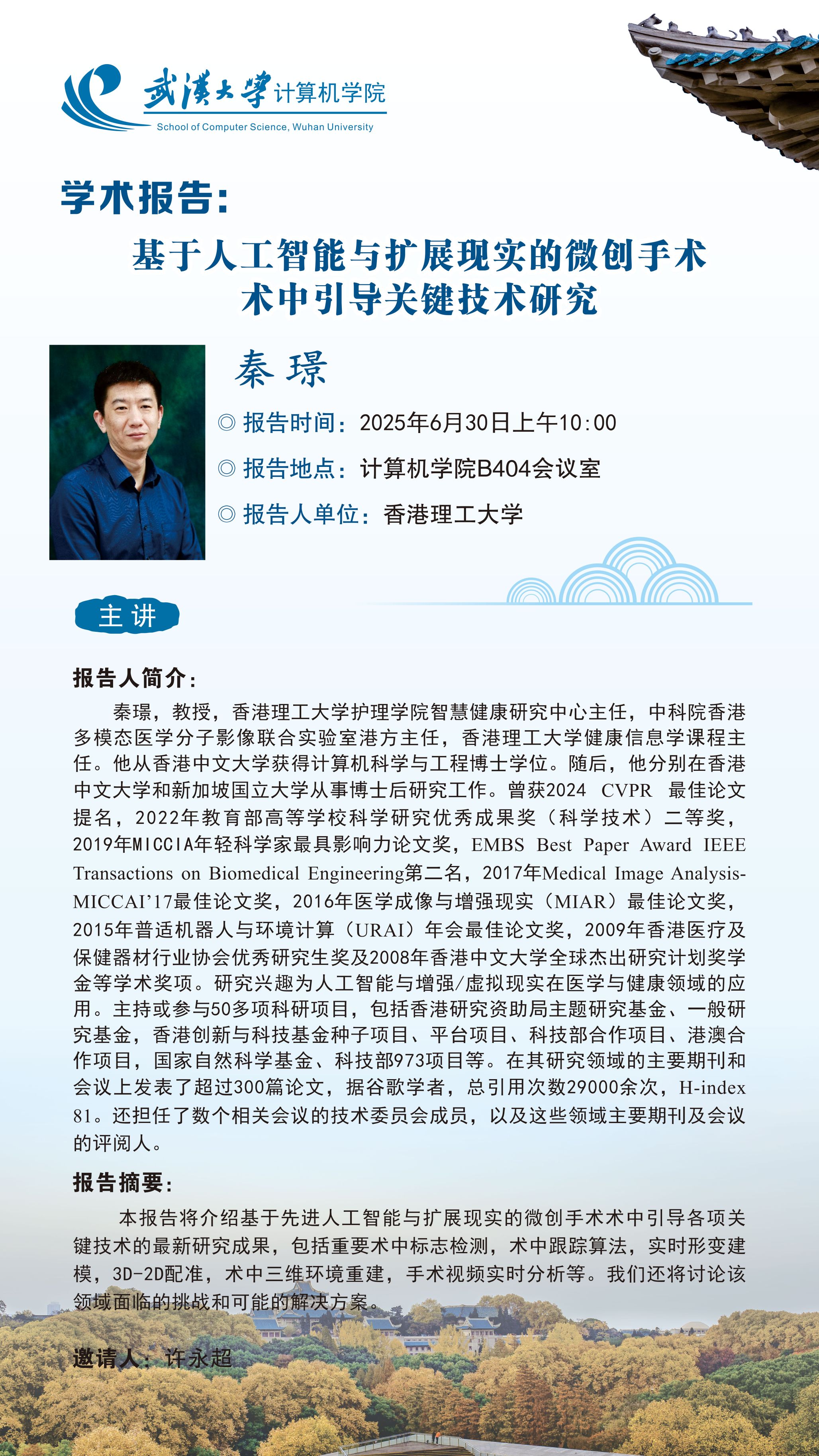 报告人简介:秦璟,教授,香港理工大学护理学院智慧健康研究中心主任,中科院香港多模态医学分子影像联合实验室港方主任,香港理工大学健康信息学课程主任。他从香港中文大学获得计算机科学与工程博士学位。随后, 他分别在香港中文大学和新加坡国立大学从事博士后研究工作。曾获2024 CVPR 最佳论文提名,2022年教育部高等学校科学研究优秀成果奖(科学技术)二等奖,2019年MICCIA年轻科学家最具影响力论文奖, EMBS Best Paper Award IEEE Transactions on Biomedical Engineering第二名,2017年Medical Image Analysis-MICCAI’17最佳论文奖,2016年医学成像与增强现实(MIAR)最佳论文奖, 2015年普适机器人与环境计算(URAI)年会最佳论文奖,2009年香港医疗及保健器材行业协会优秀研究生奖及2008年香港中文大学全球杰出研究计划奖学金等学术奖项。研究兴趣为人工智能与增强/虚拟现实在医学与健康领域的应用。主持或参与50多项科研项目,包括香港研究资助局主题研究基金、一般研究基金,香港创新与科技基金种子项目、平台项目、科技部合作项目、港澳合作项目,国家自然科学基金、科技部973项目等。在其研究领域的主要期刊和会议上发表了超过300篇论文,据谷歌学者,总引用次数29000余次,H-index 81。还担任了数个相关会议的技术委员会成员,以及这些领域主要期刊及会议的评阅人。