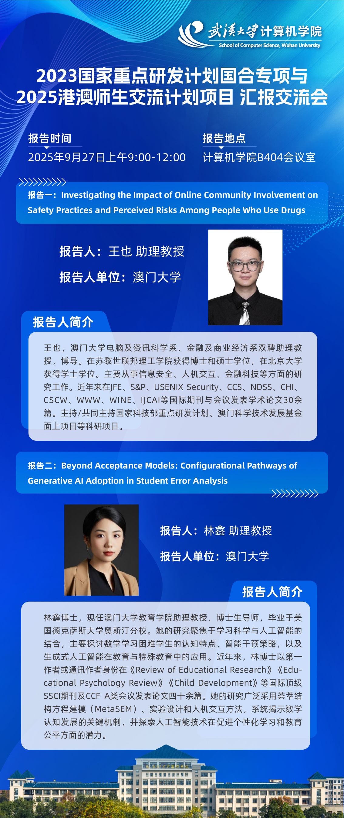 报告人简介:王也,澳门大学电脑及资讯科学系、金融及商业经济系双聘助理教授,博导。在苏黎世联邦理工学院获得博士和硕士学位,在北京大学获得学士学位。主要从事信息安全、人机交互、金融科技等方面的研究工作。近年来在JFE、S&P、USENIX Security、CCS、NDSS、CHI、CSCW、WWW、WINE、IJCAI等国际期刊与会议发表学术论文30余篇。主持/共同主持国家科技部重点研发计划、澳门科学技术发展基金面上项目等科研项目。