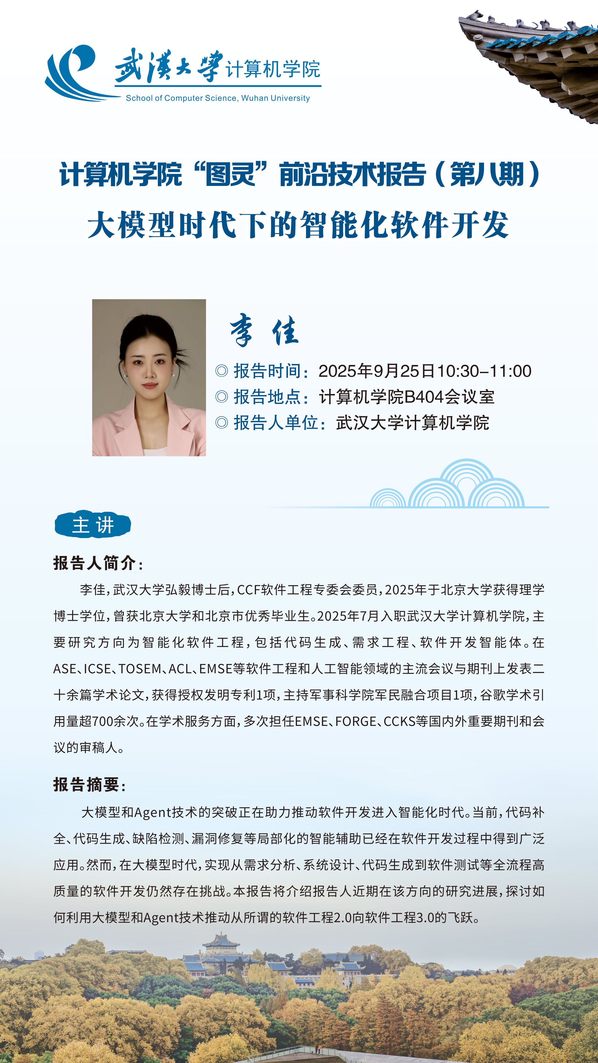 报告摘要:大模型和Agent技术的突破正在助力推动软件开发进入智能化时代。当前,代码补全、代码生成、缺陷检测、漏洞修复等局部化的智能辅助已经在软件开发过程中得到广泛应用。然而,在大模型时代,实现从需求分析、系统设计、代码生成到软件测试等全流程高质量的软件开发仍然存在挑战。本报告将介绍报告人近期在该方向的研究进展,探讨如何利用大模型和Agent技术推动从所谓的软件工程2.0向软件工程3.0的飞跃。