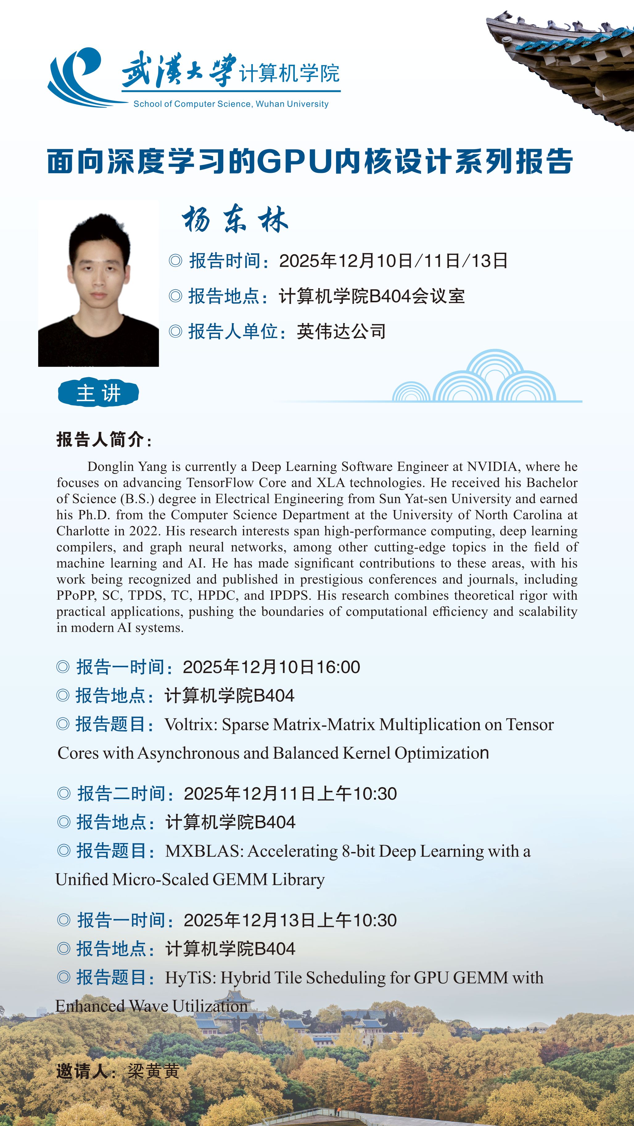 报告人简介: Donglin Yang is currently a Deep Learning Software Engineer at NVIDIA, where he focuses on advancing TensorFlow Core and XLA technologies. He received his Bachelor of Science (B.S.) degree in Electrical Engineering from Sun Yat-sen University and earned his Ph.D. from the Computer Science Department at the University of North Carolina at Charlotte in 2022. His research interests span high-performance computing, deep learning compilers, and graph neural networks, among other cutting-edge topics in the field of machine learning and AI. He has made significant contributions to these areas, with his work being recognized and published in prestigious conferences and journals, including PPoPP, SC, TPDS, TC, HPDC, and IPDPS. His research combines theoretical rigor with practical applications, pushing the boundaries of computational efficiency and scalability in modern AI systems.