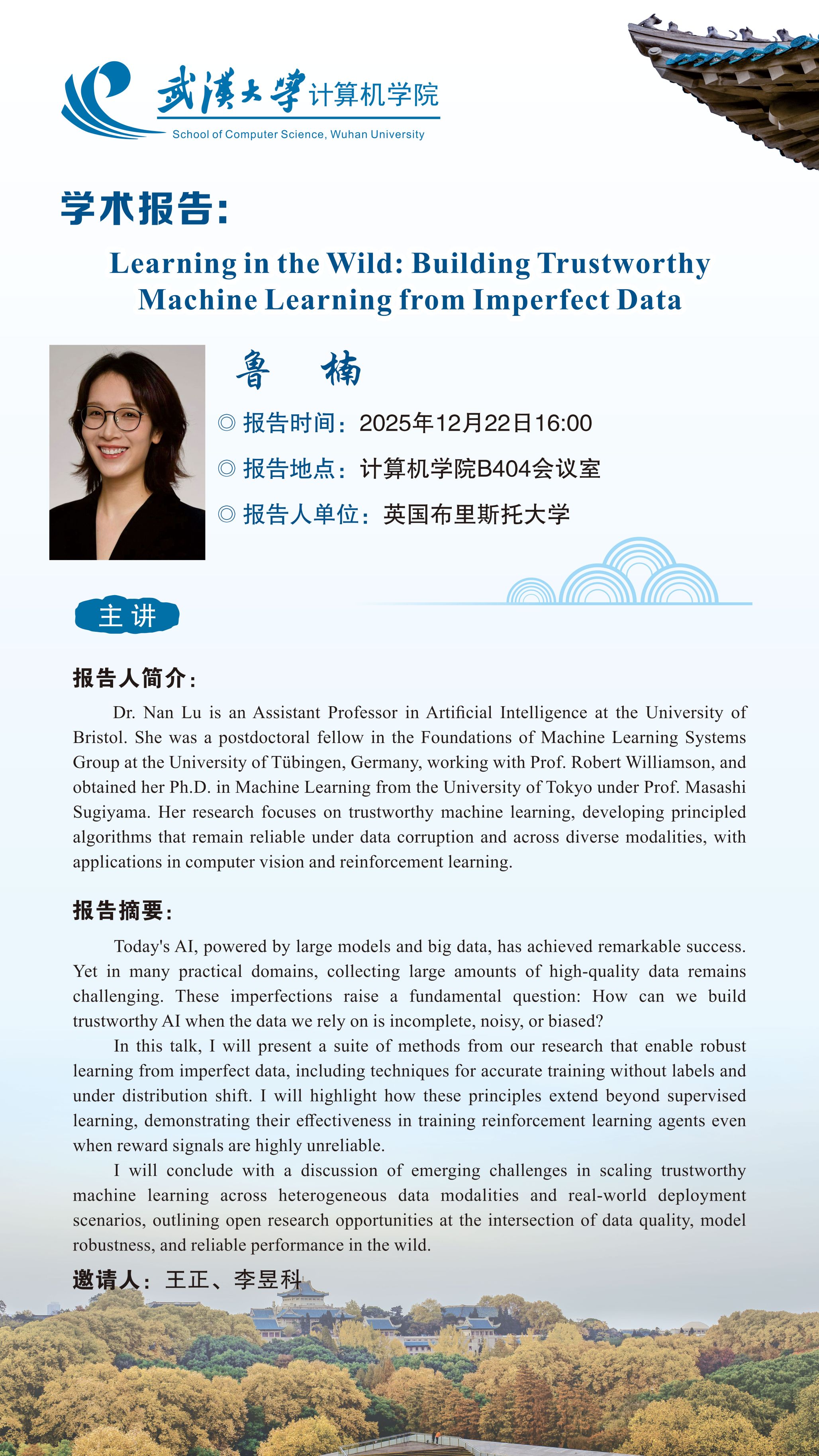 报告人简介:Dr. Nan Lu is an Assistant Professor in Artificial Intelligence at the University of Bristol. She was a postdoctoral fellow in the Foundations of Machine Learning Systems Group at the University of Tübingen, Germany, working with Prof. Robert Williamson, and obtained her Ph.D. in Machine Learning from the University of Tokyo under Prof. Masashi Sugiyama. Her research focuses on trustworthy machine learning, developing principled algorithms that remain reliable under data corruption and across diverse modalities, with applications in computer vision and reinforcement learning.