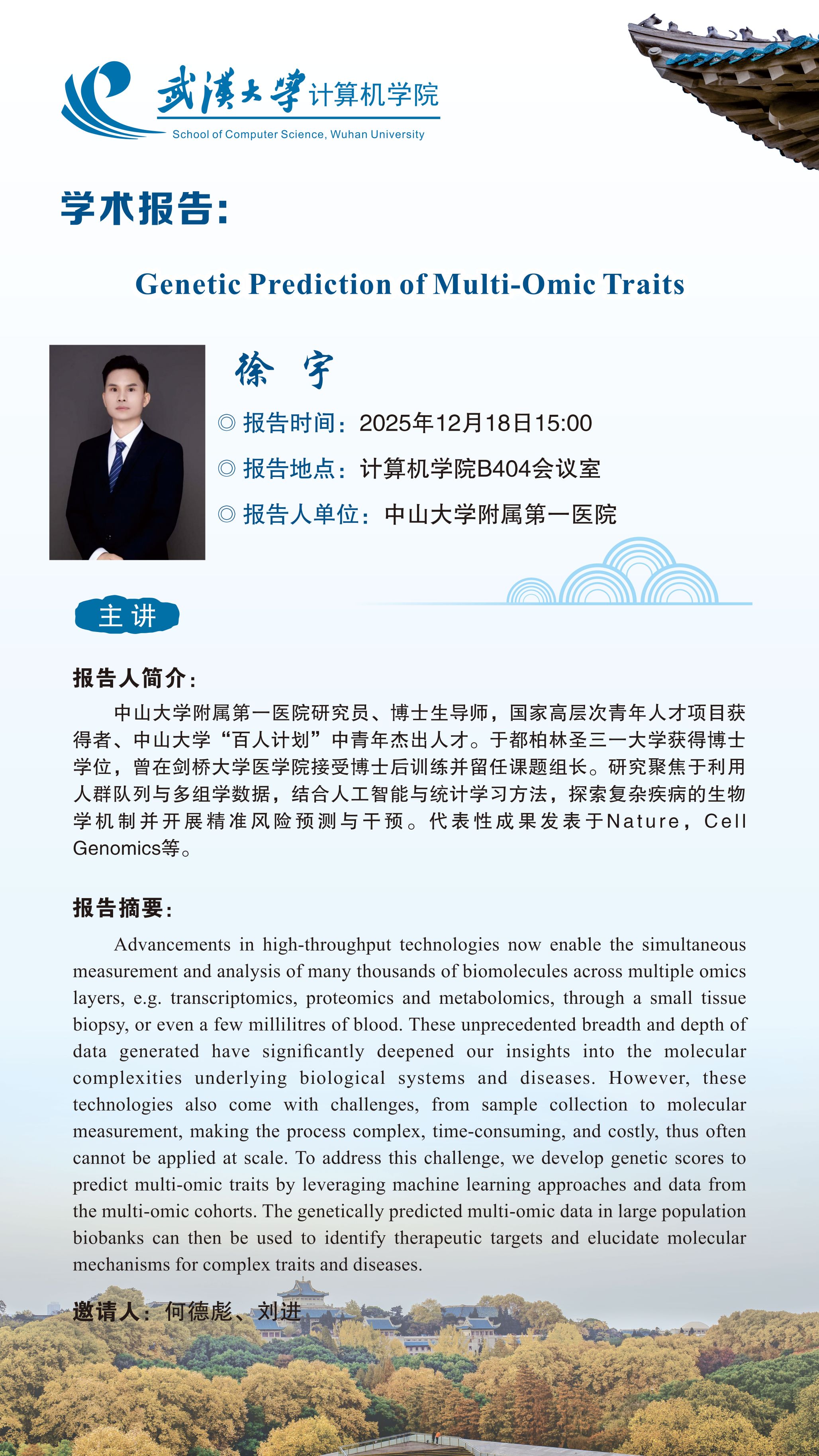报告人简介:中山大学附属第一医院研究员、博士生导师,国家高层次青年人才项目获得者、中山大学“百人计划”中青年杰出人才。于都柏林圣三一大学获得博士学位,曾在剑桥大学医学院接受博士后训练并留任课题组长。研究聚焦于利用人群队列与多组学数据,结合人工智能与统计学习方法,探索复杂疾病的生物学机制并开展精准风险预测与干预。代表性成果发表于Nature,Cell Genomics等。
