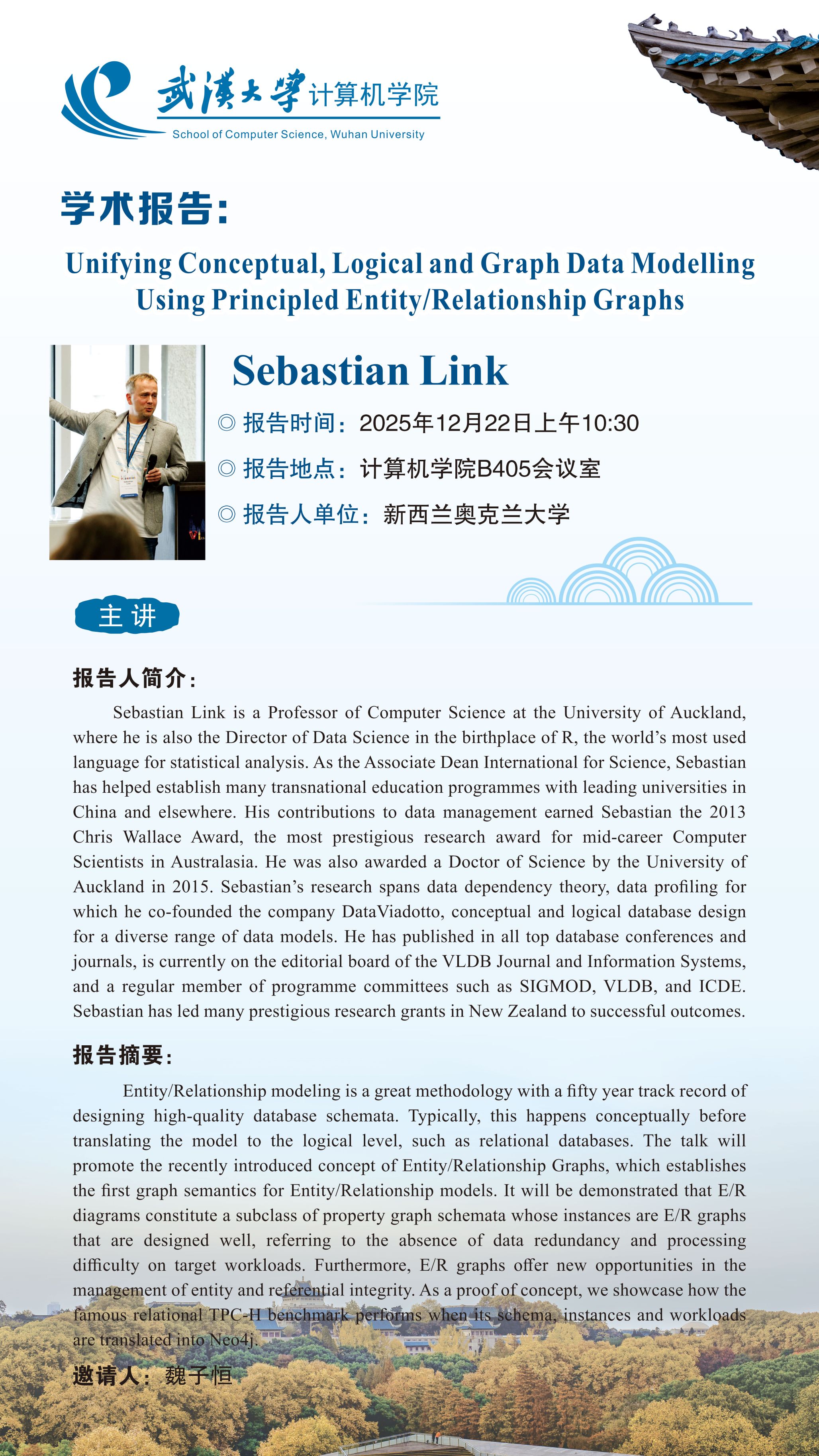 报告人简介:Sebastian Link is a Professor of Computer Science at the University of Auckland, where he is also the Director of Data Science in the birthplace of R, the world’s most used language for statistical analysis. As the Associate Dean International for Science, Sebastian has helped establish many transnational education programmes with leading universities in China and elsewhere. His contributions to data management earned Sebastian the 2013 Chris Wallace Award, the most prestigious research award for mid-career Computer Scientists in Australasia. He was also awarded a Doctor of Science by the University of Auckland in 2015. Sebastian’s research spans data dependency theory, data profiling for which he co-founded the company DataViadotto, conceptual and logical database design for a diverse range of data models. He has published in all top database conferences and journals, is currently on the editorial board of the VLDB Journal and Information Systems, and a regular member of programme committees such as SIGMOD, VLDB, and ICDE. Sebastian has led many prestigious research grants in New Zealand to successful outcomes.