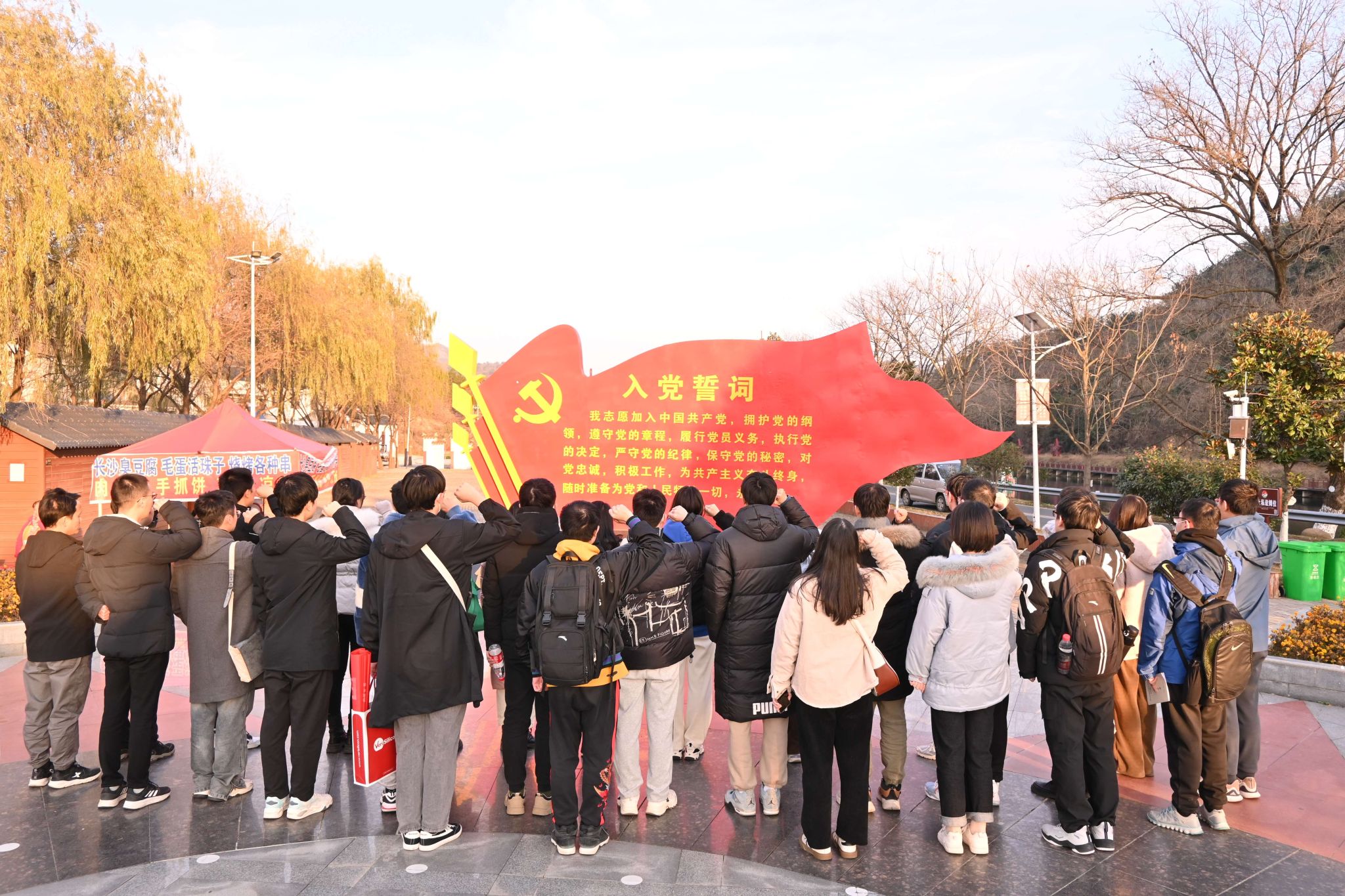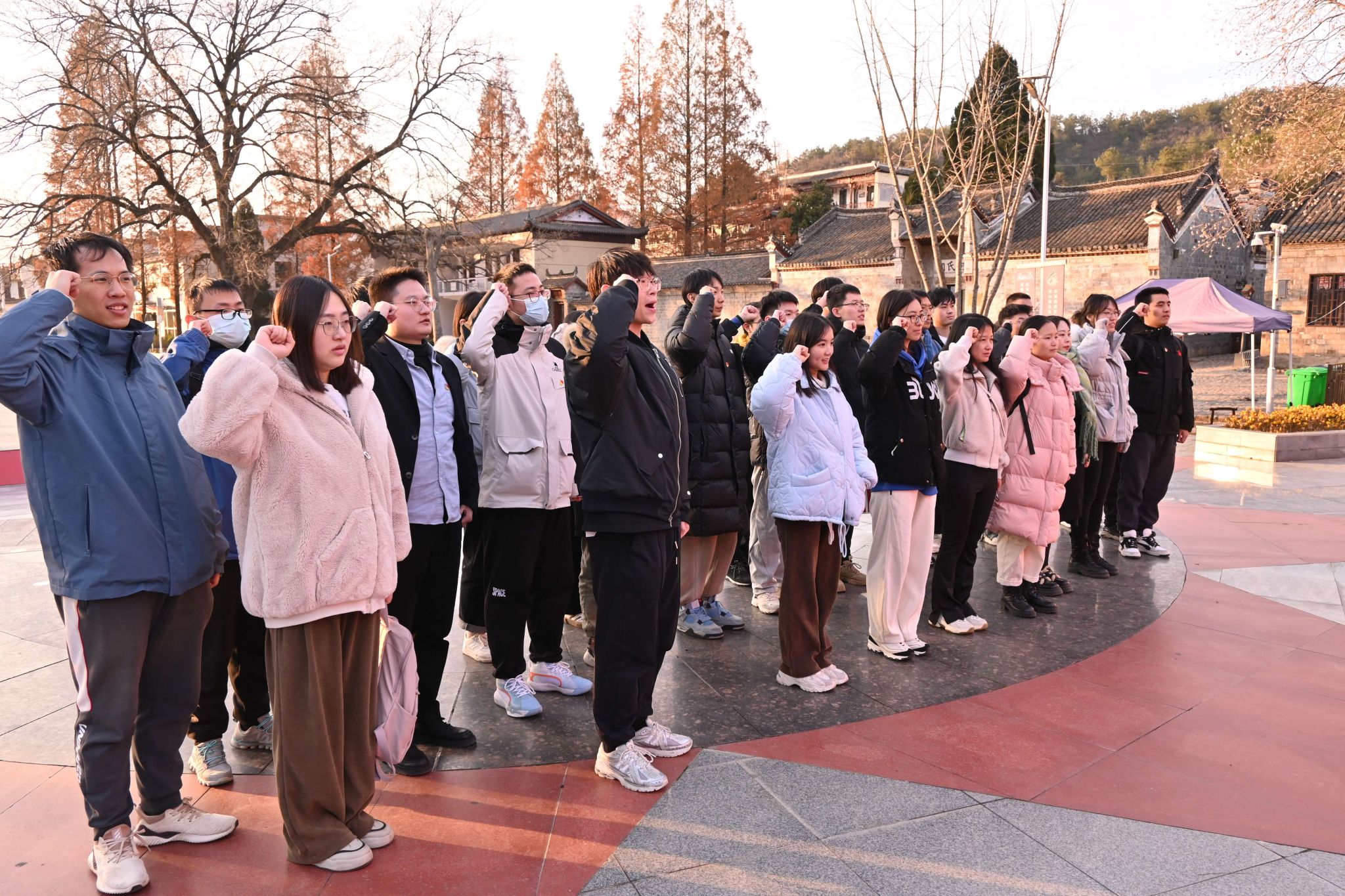 党课结束后,党员骨干们来到了红二十五军军部旧址——何氏祠,在何家冲广场庄严集合,重温入党誓词。“我志愿加入中国共产党,拥护党的纲领,遵守党的章程......”誓词声声,铿锵有力。这既是对红色历史和革命先辈的告慰,也是研究生党员铭记历史、接续奋斗、不忘初心、牢记使命的庄严承诺。