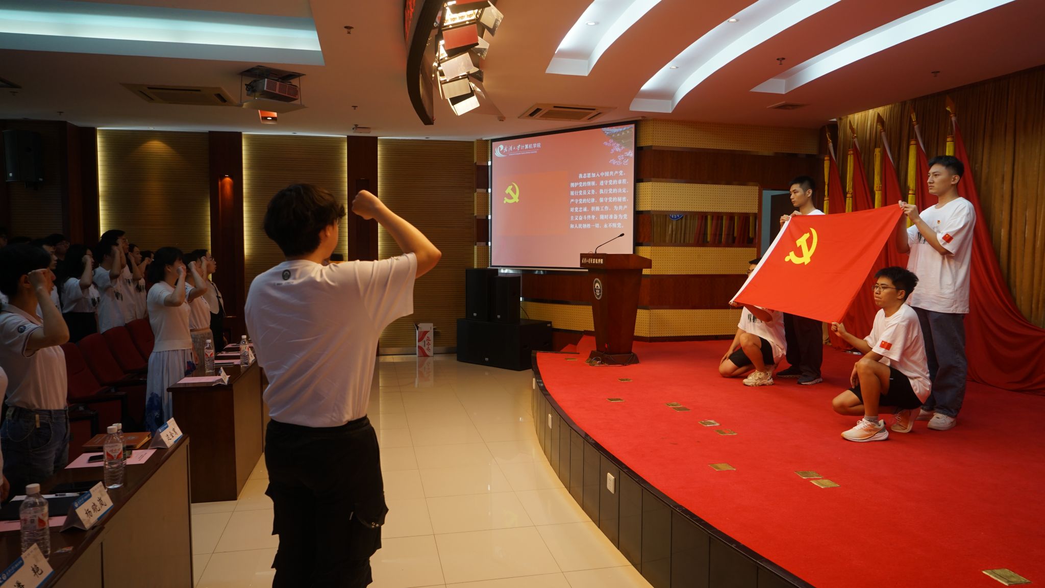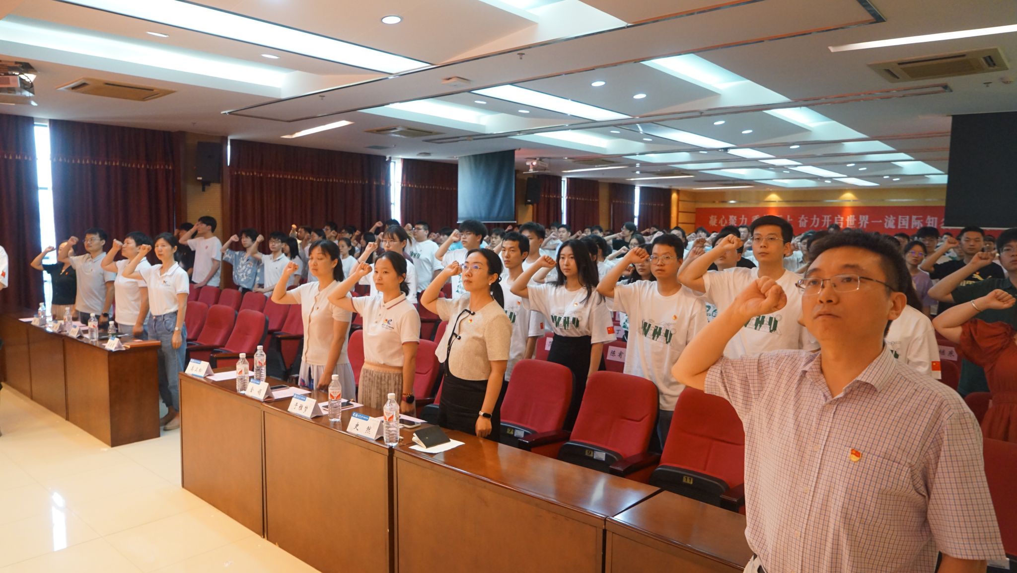 随后,毕业研究生代表沈翱弘庄严领誓,毕业生党员重温入党誓词,新党员入党宣誓。全体与会党员面向鲜红的党旗,右拳紧握郑重宣誓,铮铮誓言铿锵有力,拳拳初心熠熠生辉。