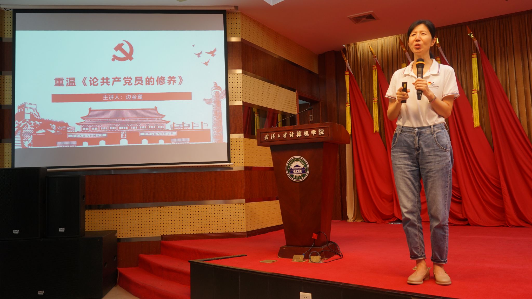 边金鸾带领全体与会成员重温了《论共产党员的修养》这本由刘少奇同志所写的共产党员修养的理论。她指出,党性修养对于共产党员来说,是一辈子的事而不是一阵子的事,是一生的必修课。党性不会随着党龄增长,觉悟不会跟着职务提升,只有与时俱进不断修炼党性,才能永葆初心不偏航。边金鸾结合书中的九个问题阐述了共产党员个人利益无条件服从党的利益以及地方党组织的利益服从全党的利益、局部利益服从整体利益、暂时利益服从长远利益的马克思列宁主义原则和党内团结的重要性。最后,她希望同学们能够运用好“批评与自我批评”这件法宝,不断提升党性修养,热爱伟大祖国,积极投身于科技强国、人才强国事业之中,积极响应国家创新驱动发展战略,为我国的产业升级贡献自己的才智。
