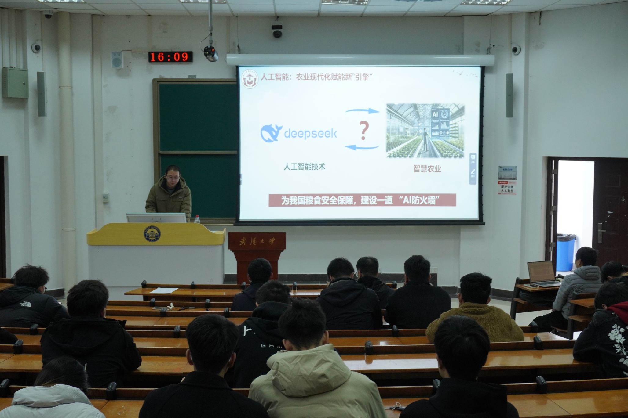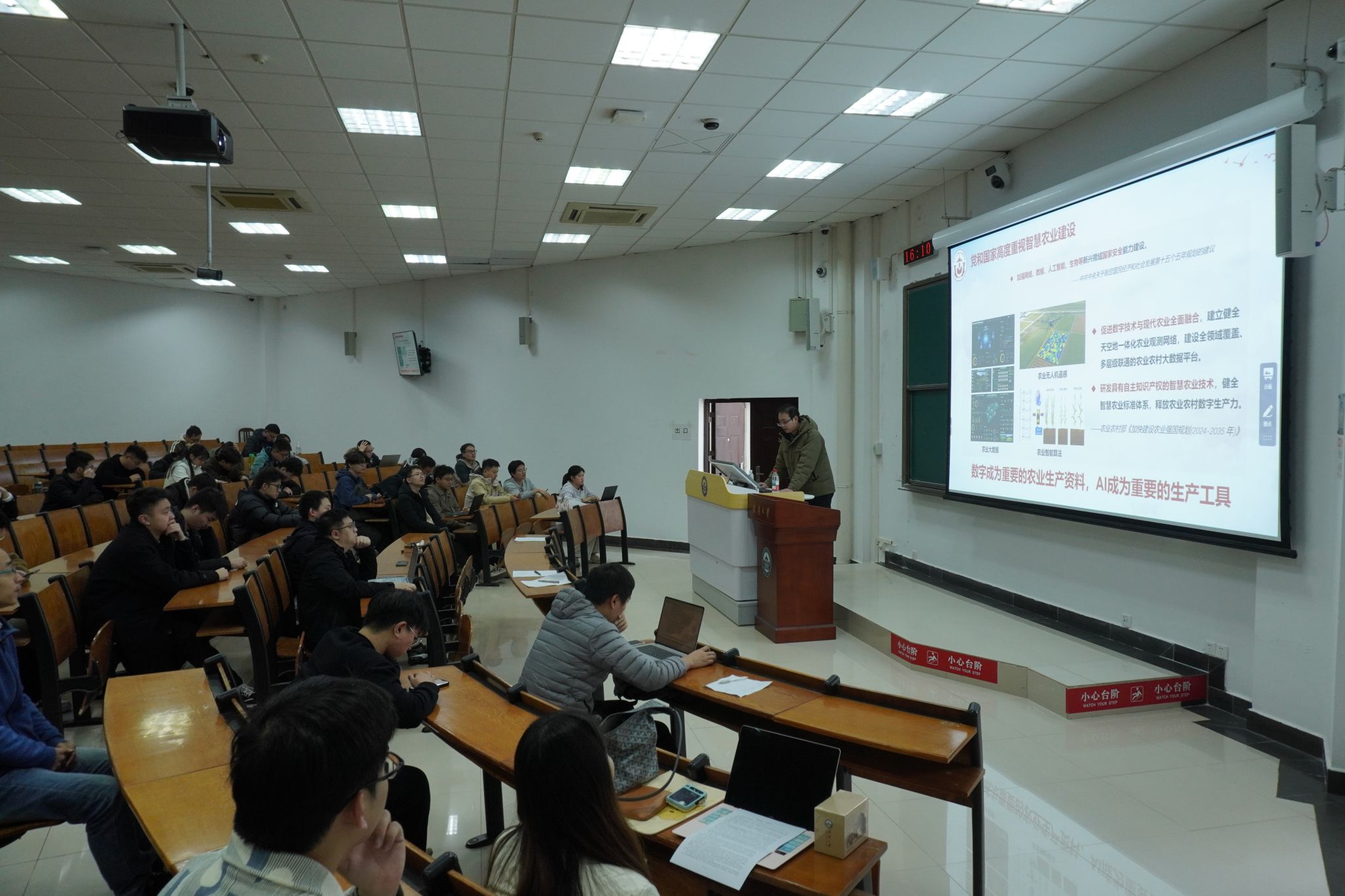 “粮食安全是‘国之大者’,回望历史教训更能明晰其战略意义。”徐浩林讲师以《从田间到云端》为题,聚焦国家在“十五五”期间关于提高粮食供给能力、强化农业科技支撑的战略部署,系统阐释我国从“藏粮于地”到“藏粮于技”的农业现代化转型历程,重点解析人工智能等新技术推动形成的“AI+农业”新模式,并结合85porn 数字水利与人工智能团队的研究成果,讲述了青年在服务农业高质量发展中的探索实践,充分展现了武大科研工作者 “把论文写在祖国大地上”的责任担当。