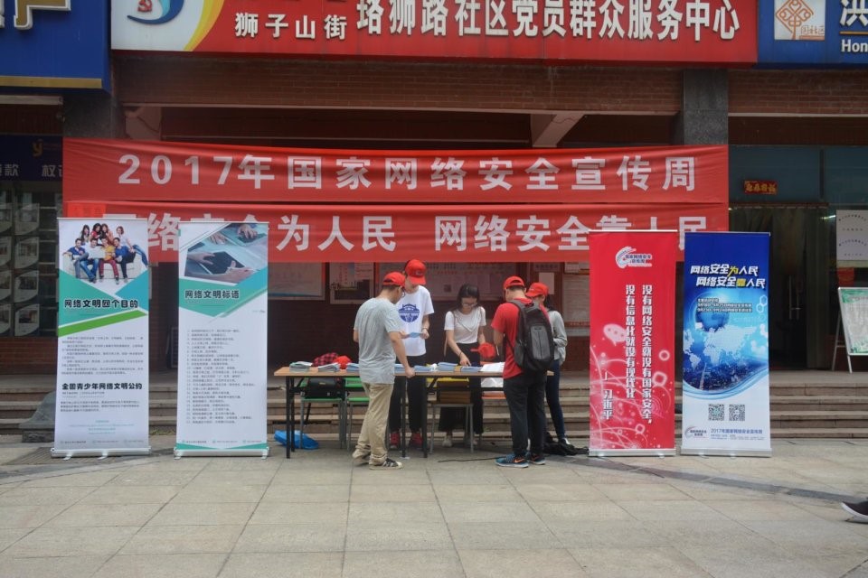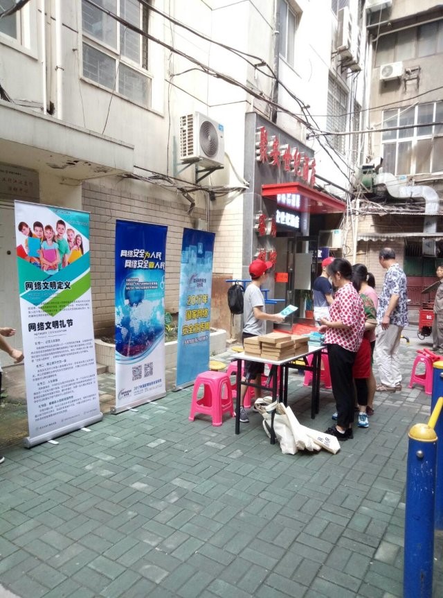 研究生党总支组织十六名志愿者走进社区。志愿者分为三组,分别前往江汉区新育社区、洪山区湘龙鑫城社区和瑞湖天地小区进行定点宣传。志愿者向居民发放宣传册,深入宣传网络安全及网络文明知识,对居民在使用网络时遇到的问题进行了耐心的讲解,同时也号召大家在网络中文明用语,对他人多一份包容和理解,做文明网民。