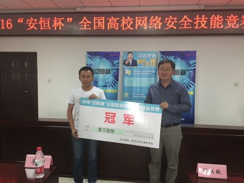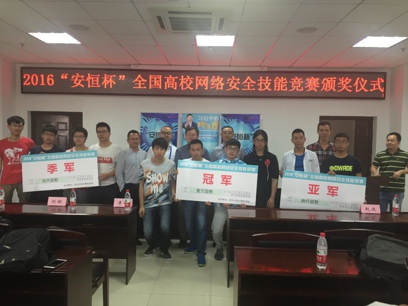 主办了2016“安恒杯”全国高校网络安全技能竞赛,来自清华大学、北京航空航天大学、北京邮电大学、华中科技大学、南京邮电大学、湖北大学等重点高校的13支团队、52名在校大学生参与了此次比赛。杭州安恒信息技术有限公司提供了平台支持。