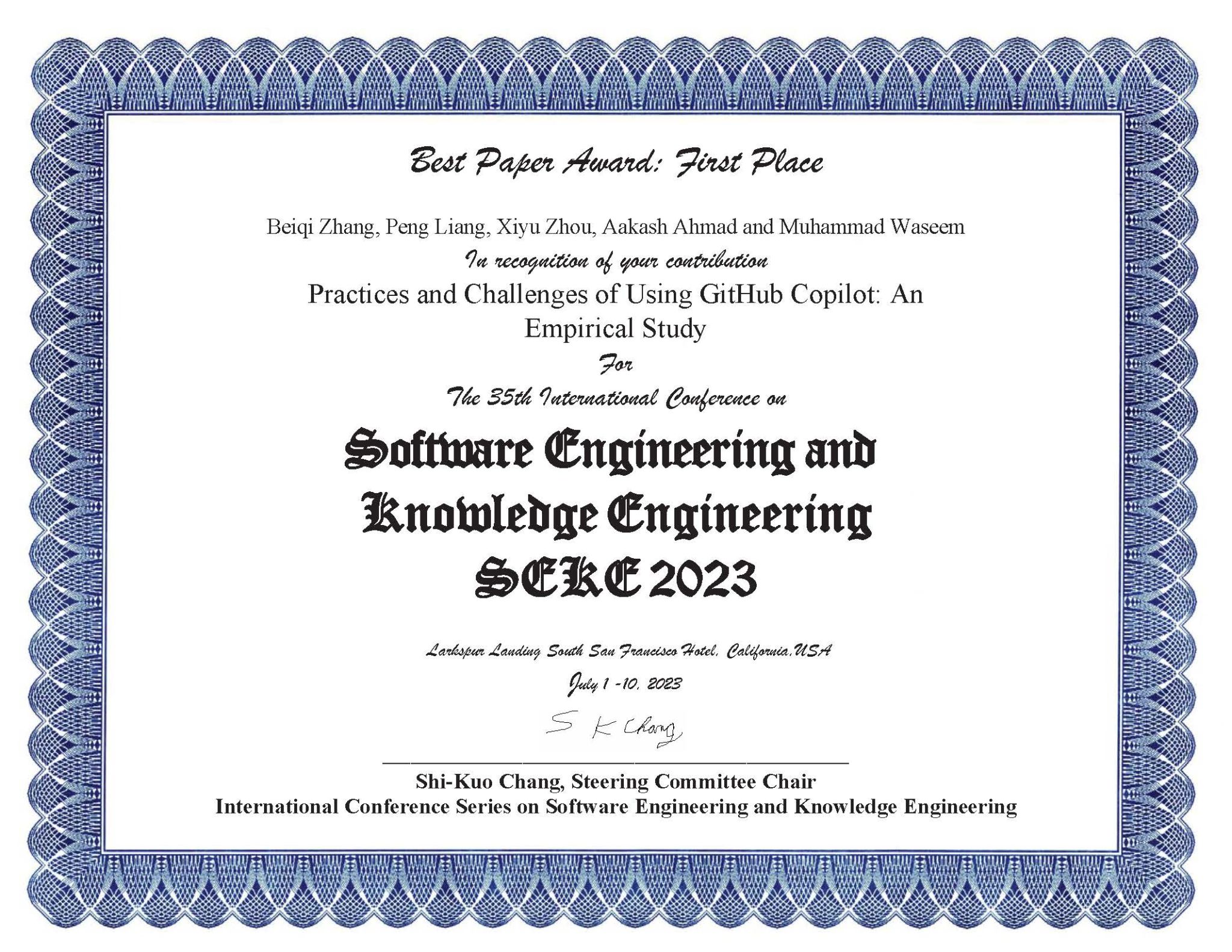 智能化软件与服务研究所梁鹏教授团队的论文《Practices and Challenges of Using GitHub Copilot: An Empirical Study》获得了大会颁发的唯一最佳论文奖一等奖(Best Paper Award: First Place)。