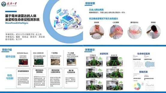 《PulmoSense-针对慢阻肺患者的肺感知智能康复系统》项目(指导老师:武小平、牛晓光),关注慢阻肺患者的康复问题,利用毫米波雷达和血氧传感器,基于BlazePose模型等技术,实现了通过实时呼吸检测,进行健康数据采集,之后数据上传云端,再给出合理的康复运动建议,最后呈现一个健康报告,来给患者提供一个集成、便携、易用的服务。