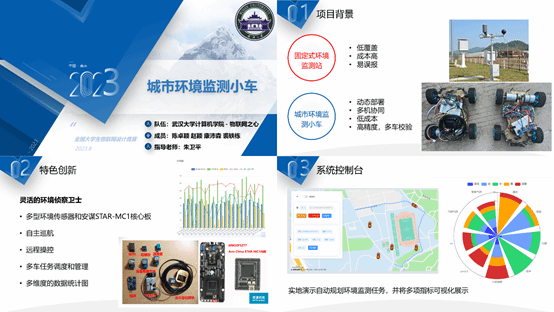 《城市环境监测小车》项目(指导老师:朱卫平),针对固定式环境监测站低覆盖、高成本、易误报的问题,以灵动MM32F5270作为主控板,实现动态部署、多机协同、低成本、高精度的环境监测小车。项目支持小车群组自主巡航,任务远程下达,丰富数据分析,定制化预警;提供数据共享接口,打造互联共享的智能物联网系统。