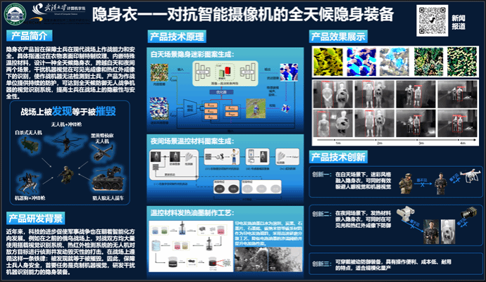 项目负责人表示,在完成作品过程中,团队针对白天场景,生成具有迷彩风格的高鲁棒性的特殊图案印制在衣物上,以此干扰基于相机的机器视觉检测;针对夜晚场景,利用温控材料发热油墨粘贴在衣物上,使得在热红外摄像头的成像上呈现出特殊色块,干扰基于红外成像的机器视觉检测。实现了全天候全面被动防御,具有“防得住”,“防得牢”,“防得巧”的优势。在指导老师们的悉心指导和团队成员的通力合作下,项目作品最终脱颖而出,荣获“恒星级”奖项。