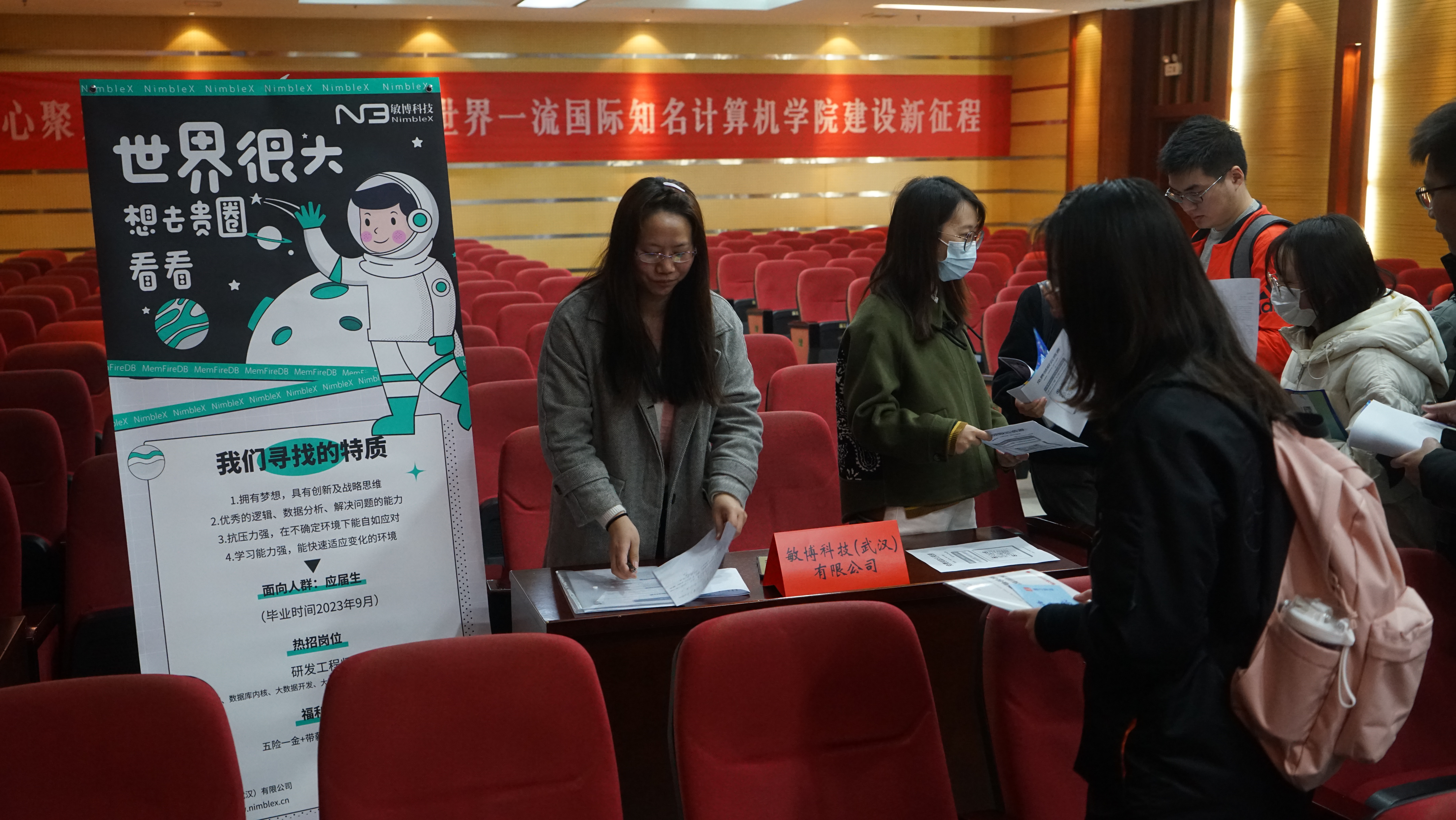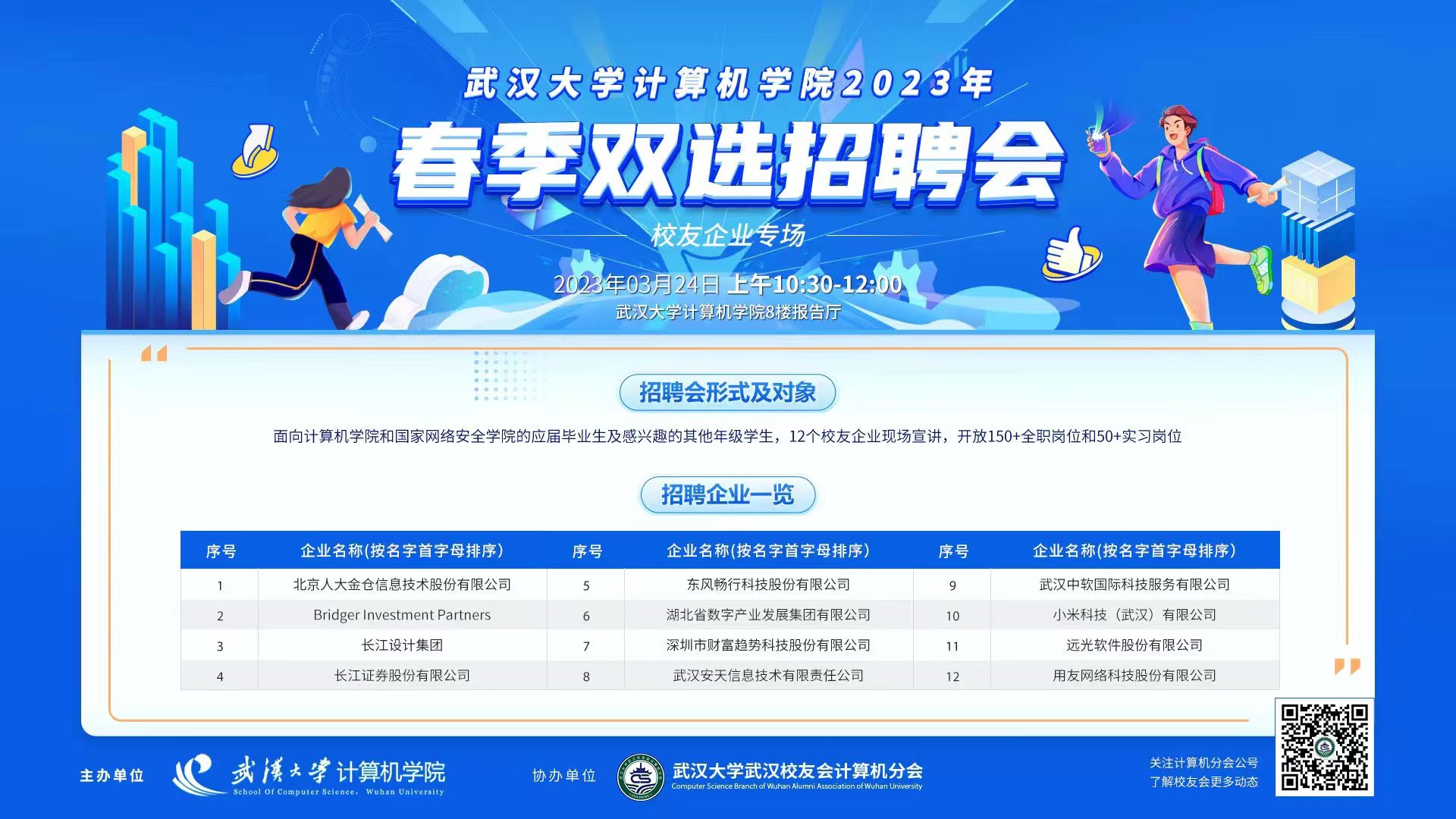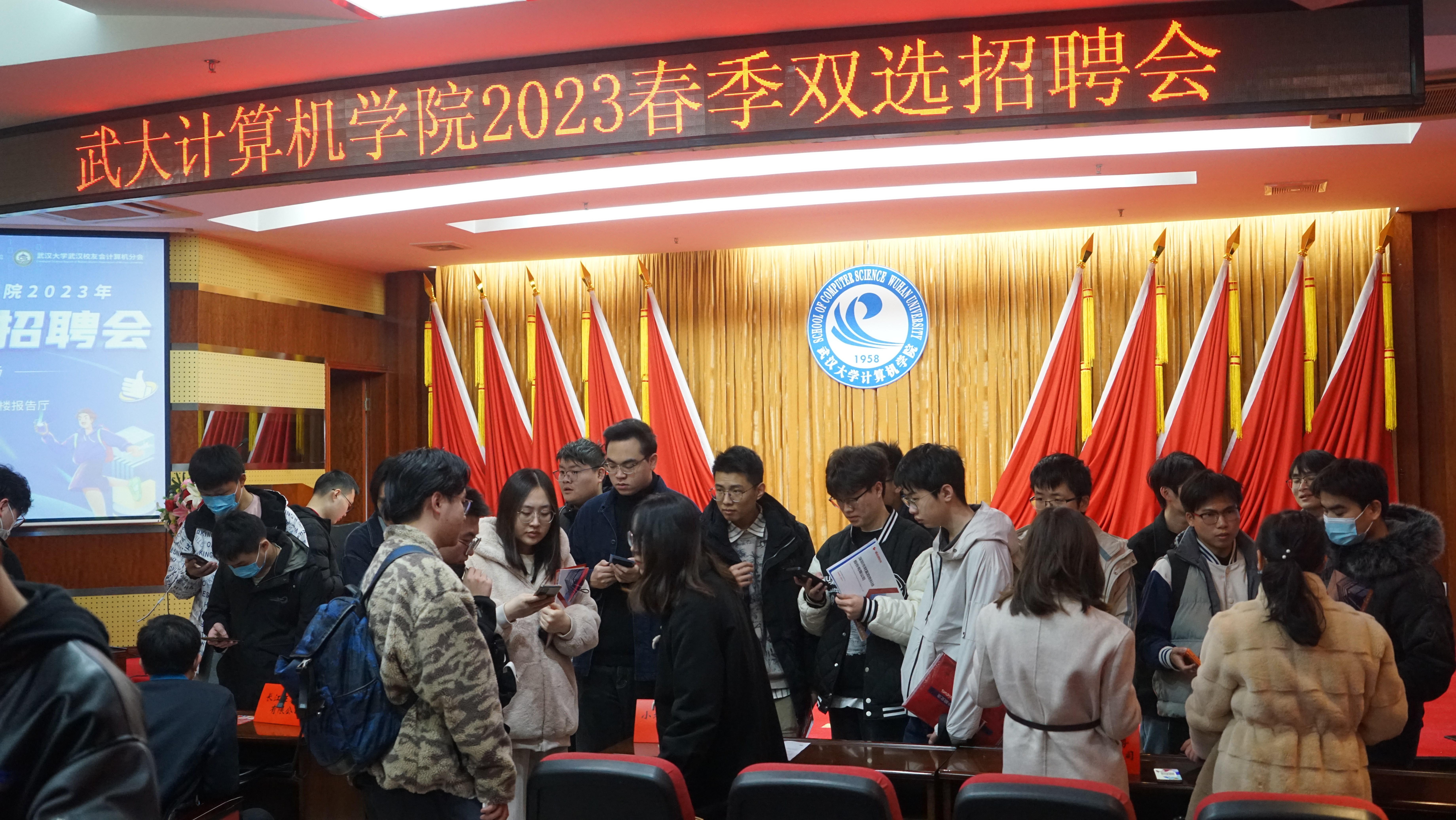 在八楼报告厅举办2023年春季双选招聘会,邀请校友企业回“珈”招聘,为毕业生送岗上门。