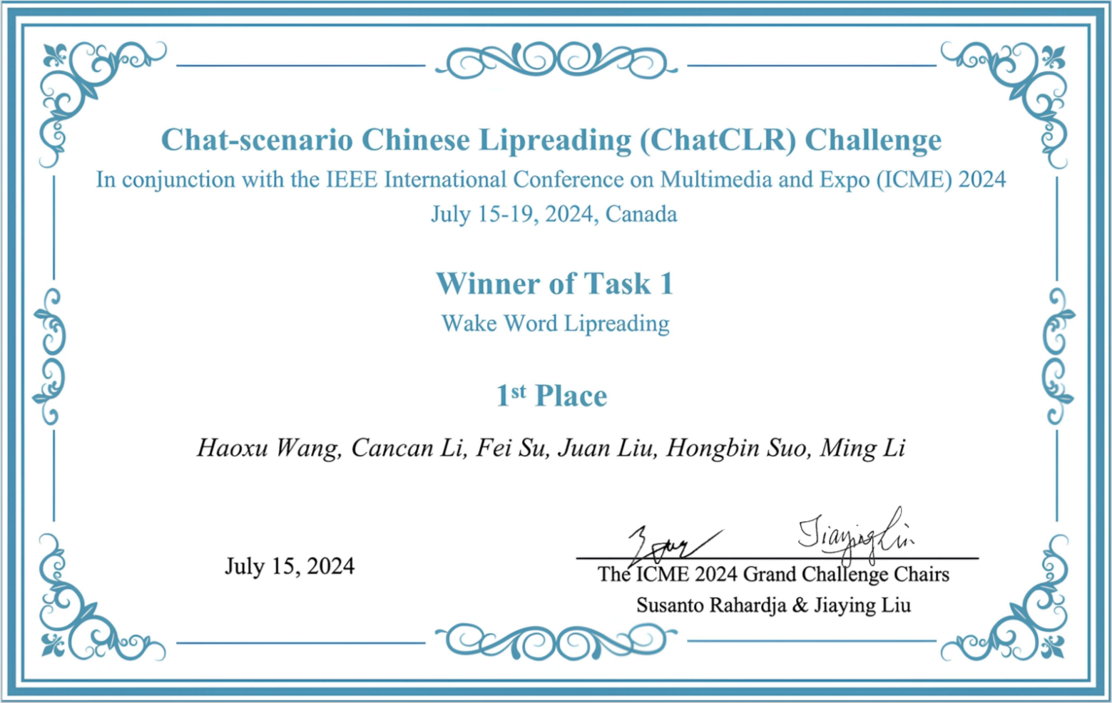 参赛团队以预训练前端和基于Transformer后端架构为基础,结合注意力池化和分类器,并引入多层特征聚合技术,在ChatCLR比赛“唤醒词唇读”赛道中开发的唤醒词唇读系统取得了优异成绩。此外,团队比赛论文已被IEEE ICME 2024竞赛单元录用。