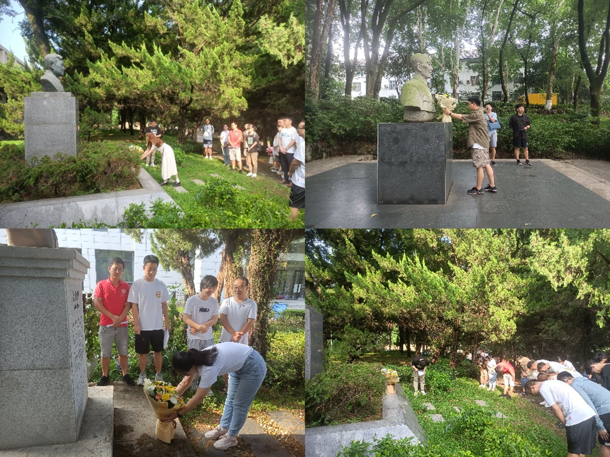 在四位科学前辈的塑像旁,党员代表献上鲜花,全体成员深深鞠躬以表达对先生们的深切怀念和崇高敬意。