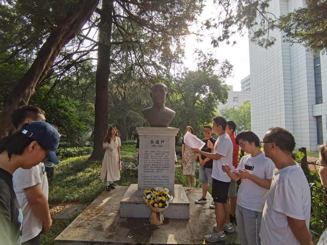 随后,全体党员同志移步至信息学部图书馆金通尹先生铜像前,遥感二支部组织委员左肖龙同志介绍了金通尹先生的生平事迹。战火纷飞的年代,金通尹先生积极组织救国,辞去一切职务,闭门谢客,蓄须明志,读书赋诗以寄忧国忧民之情,保持民族气节。新中国成立初期,虽年逾花甲,生活有诸多不便,但为了新中国的教育事业,金通尹先生毅然离开居住数十年的上海,只身赴任青岛工学院院长。1956年武汉测量制图学院诞生,金通尹先生从青岛来到武汉,为学校建设昼夜操劳不遗余力,将他自己40余年从事教育事业的宝贵经验带给了武汉测绘学院,为奠定新中国民用测绘高等教育的基础和发展新中国高等教育事业作出了重大贡献。