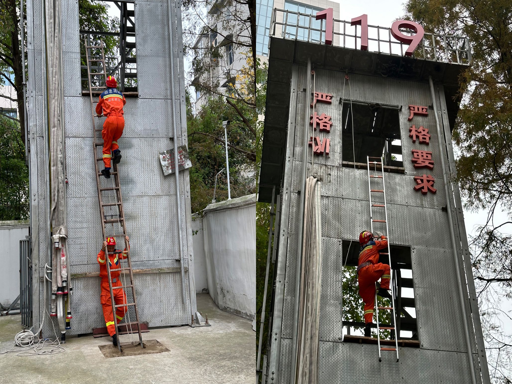 在随后的实操和展示环节中,消防员首先向师生们展示了伸缩梯、挂钩梯攀爬等消防科目表演和技能,当看到消防员敏捷的爬上训练塔的瞬间,在场师生用掌声向消防员娴熟的技术表达敬佩之情,向火场中最美的逆行者致敬。随后,消防员启动消防灭火车并邀请同学们体验消防水枪,体验期间也向同学们讲解了不同水枪的特点以及操作要领,同学们纷纷上前体验,感受操作灭火水枪的快感。