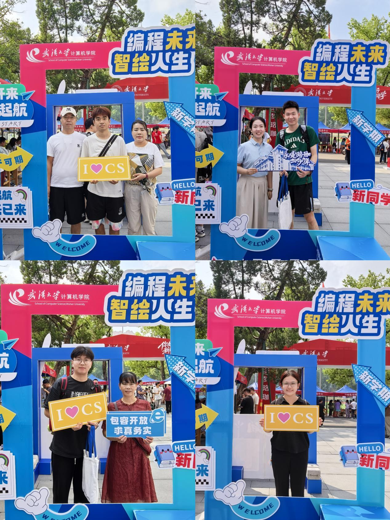 报到完成后,不少新生和家长纷纷举起“e起向未来”“面向珞珈山编程”“我爱CS”“怀揣编程梦想,共创IT未来”等手牌,来到学院搭建的合影框前打卡留念,镜头记录下的不仅是回忆,更是新生们对于未来研究生生活的美好期许和憧憬。
