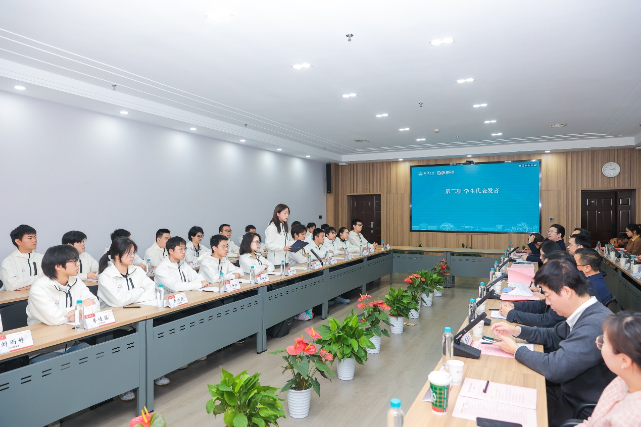 学生代表胡知非在发言中分享了她与武大的深厚渊源、选择雷军班的初心、入学以来的学习生活体验以及对未来发展的憧憬。她表示,雷军班前瞻性的育人体系、小班化教学、个性化培养和与产业紧密接轨的课程设置,激发了同学们的求知热情,期待在雷军班度过最幸福、最有意义、最难忘的大学生活。