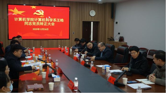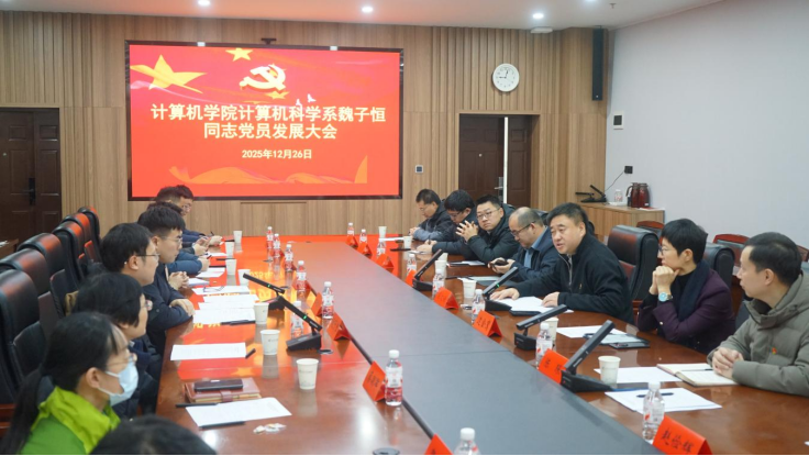 2025年12月26日上午,计算机科学系教工党支部召开党员发展大会,讨论接收高层次人才魏子恒教授为中共预备党员,会议由支部书记江佳伟同志主持,校党委常委、党委副书记屈文谦同志,学院党委书记边金鸾同志、学院院长何德彪同志、学院党委副书记陈琛同志以及计算机科学系教工党支部全体党员出席会议。