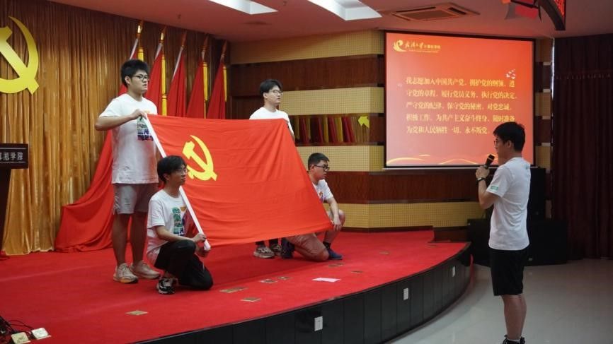 在奏唱国歌之后,2019级本科生任旭滨庄严领誓。全体毕业生党员面向鲜红的党旗,右拳紧握郑重宣誓,声声入耳振奋人心。誓词铿锵有力,感召初心使命;学子目光如炬,凝聚奋进之力。