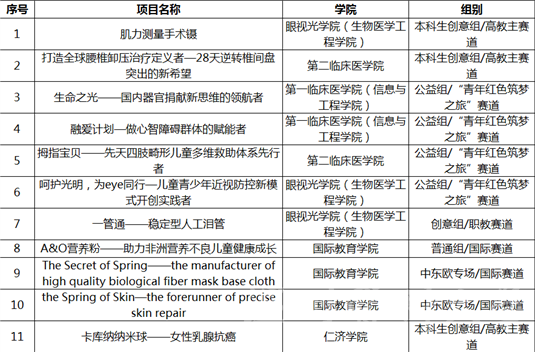 学校自今年1月份开始稳步开展项目孵化工作,共收到参赛作品一百余项,参赛率近30%。经过激烈角逐,《打造全球腰椎卸压治疗定义者—28天逆转椎间盘突出的新希望》等3个项目获得高教主赛道金奖,《融爱计划—做心智障碍群体的赋能者》等4个项目获得“青年红色筑梦之旅”赛道金奖,《The Secret of Spring-the manufacturer of high quality biological fiber mask base cloth》等3个项目获得国际赛道金奖,《一管通——稳定型人工泪管》项目获得职教赛道金奖。
