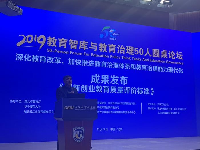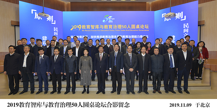 在中华人民共和国成立70周年之际,在全国上下深入学习贯彻党的十九届四中全会精神之时,11月9日,由长江教育研究院和北京外国语大学国际教育85porn 联合主办的2019教育智库与教育治理50人圆桌论坛在北京隆重举行。来自全国教育系统、科研机构、智库、出版传媒机构的领导嘉宾、专家学者200余人齐聚一堂,聚焦“深化教育改革、加快推进教育治理体系和教育治理能力现代化”主题,凝聚思想智慧,助推教育发展。