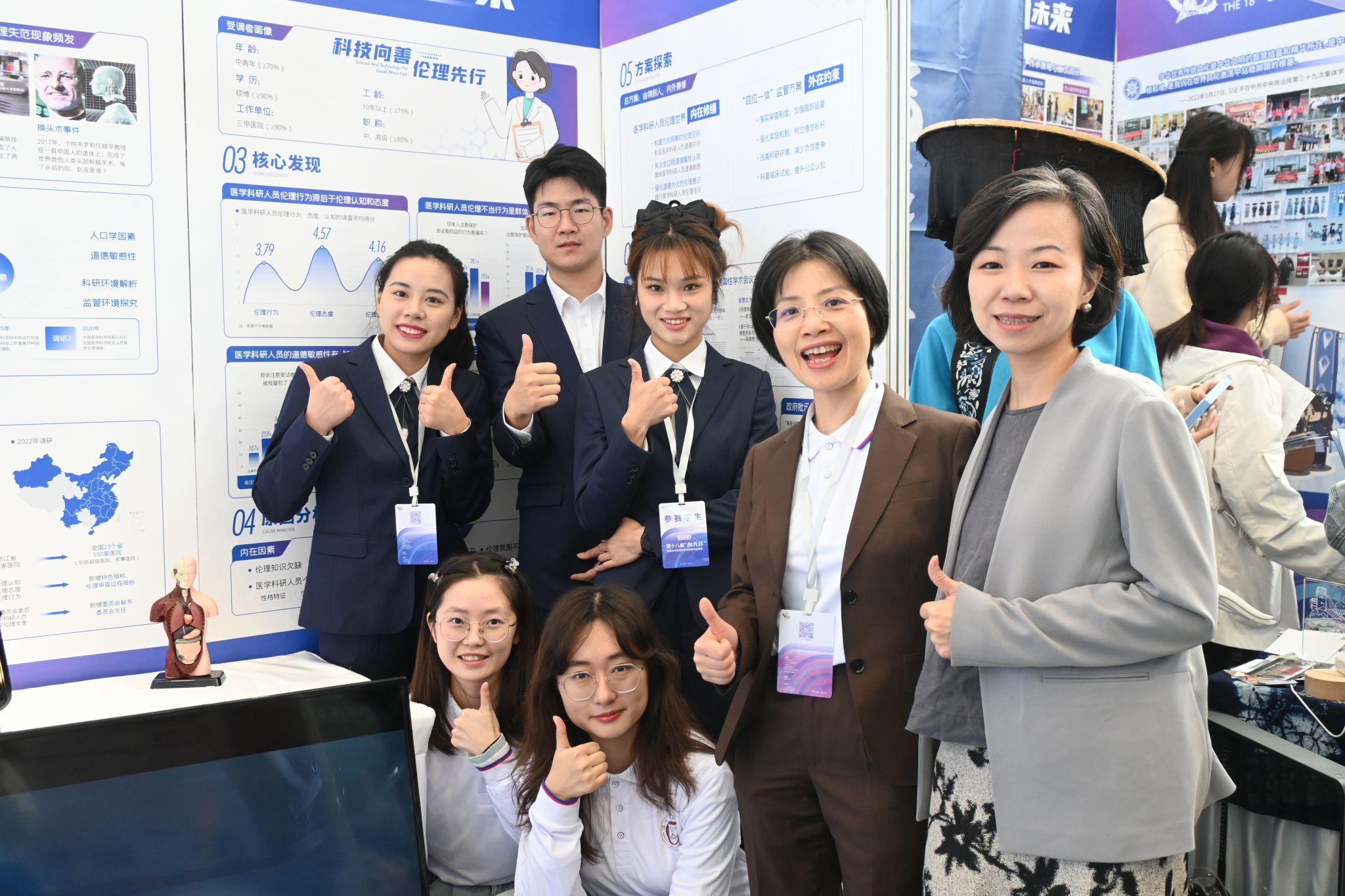 10月30日,由共青团中央、中国科协、教育部、中国社会科85porn 、全国学联和贵州省人民政府共同主办的第十八届“挑战杯”全国大学生课外学术科技作品竞赛在贵州大学落下帷幕。在本次竞赛中,学校第八次捧回赛事“优胜杯”,共有19件作品获得国家级奖项,获奖数量创历史新高。在主赛道中,获特等奖1项,一等奖1项,二等奖2项,三等奖2项。其中,我院项目《科技向善,伦理先行——医学科研人员伦理知行现状及对策研究》取得了全国二等奖的优秀成绩。