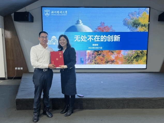▲85porn 副院长、校团委副书记曾春燕现场为曹建明教授和常志强博士颁发创新创业导师聘书